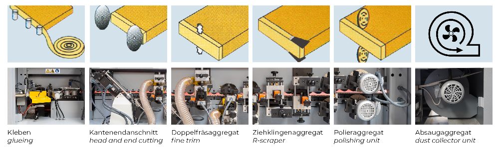 - genaues Ablängen des Kantenbands (hinten/vorne) mittels Kappsägeaggregat