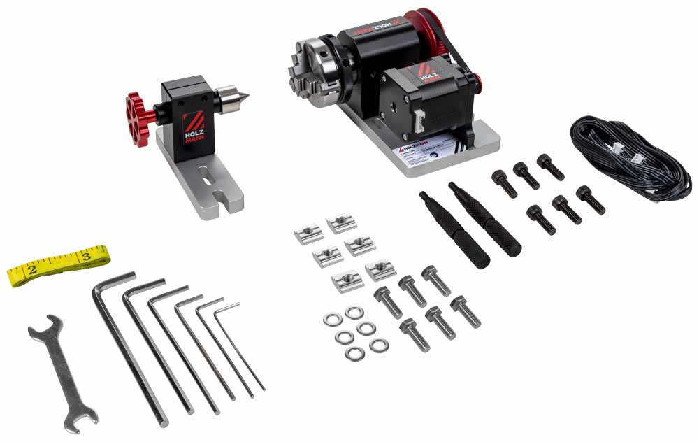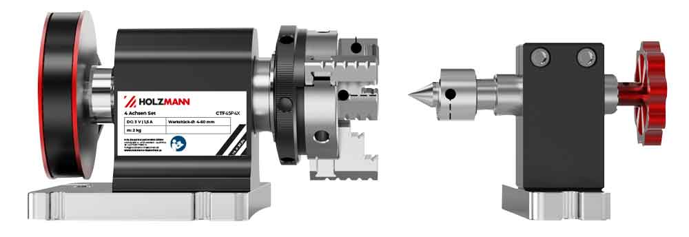 Das HOLZMANN 4 Achsen Set CTF45P4x ermöglicht die Bearbeitung von rotationssymmetrischen Bauteilen. Die Ansteuerung und Anbindung erfolgen direkt über die Schnittstellen welche die CNC Tischfräse CTF45P_230V zur Verfügung stellt.